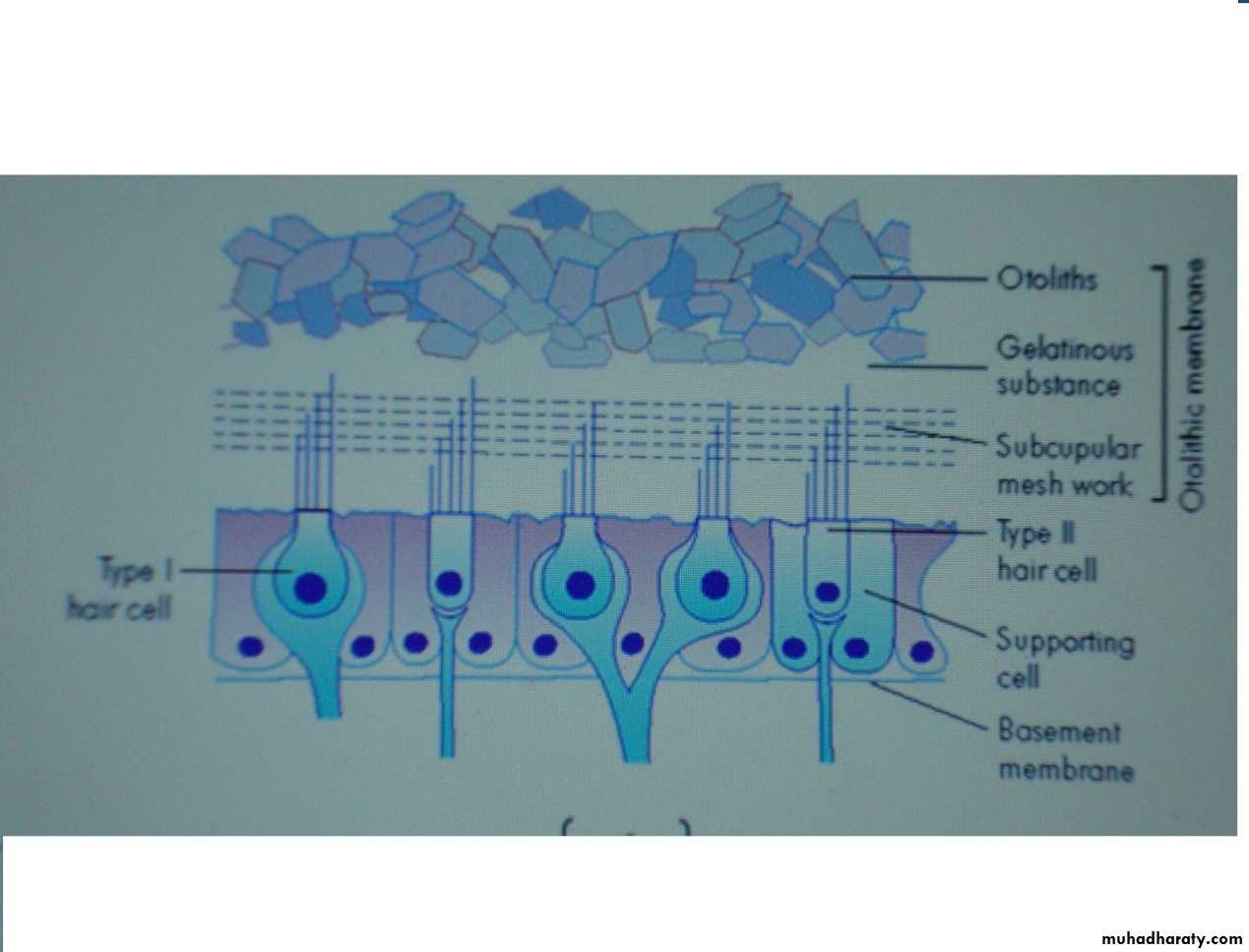 In the macula, a gelatinous material overlies the sensory hair cells, the stereocilia and kinocilium also project into the under surface of this gelatinous membrane which is called otoconial membrane.