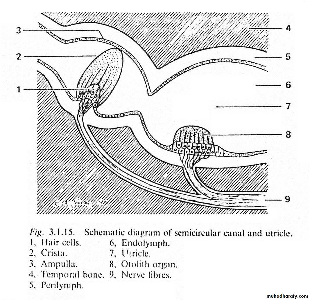 1-Semicircular ducts: there are semicircular ducts lie in the bony semicircular canals. Each duct has ampulla at one end which contains the sensory vestibular cells (the crista), the hair cells of the crista have long filaments which project into a mass of gelatinous material called the cupula. During angular acceleration, the movement of endolymph through the space between the crista and cupula leads to deflection of the cupula and cilia of the hair cells resulting in ↑ or ↓ neural output of the sensory hair cells according to the direction of deflection of the cilia.2- Saccule: the saccule lies in the spherical recess of the bony vestibule, it is globular in shape. The sensory vestibular cells are present in the anterior wall of the saccule called the macula.