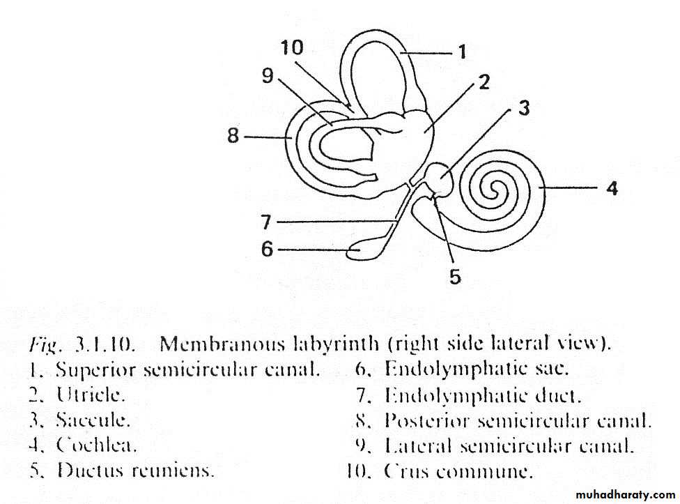 3- Utricle: the utricle lies in the elliptical recess of the bony vestibule, the sensory vestibular cells are present in the lateral wall of the utricle called the macula. The semicircular ducts communicate with utricle by 5 openings.