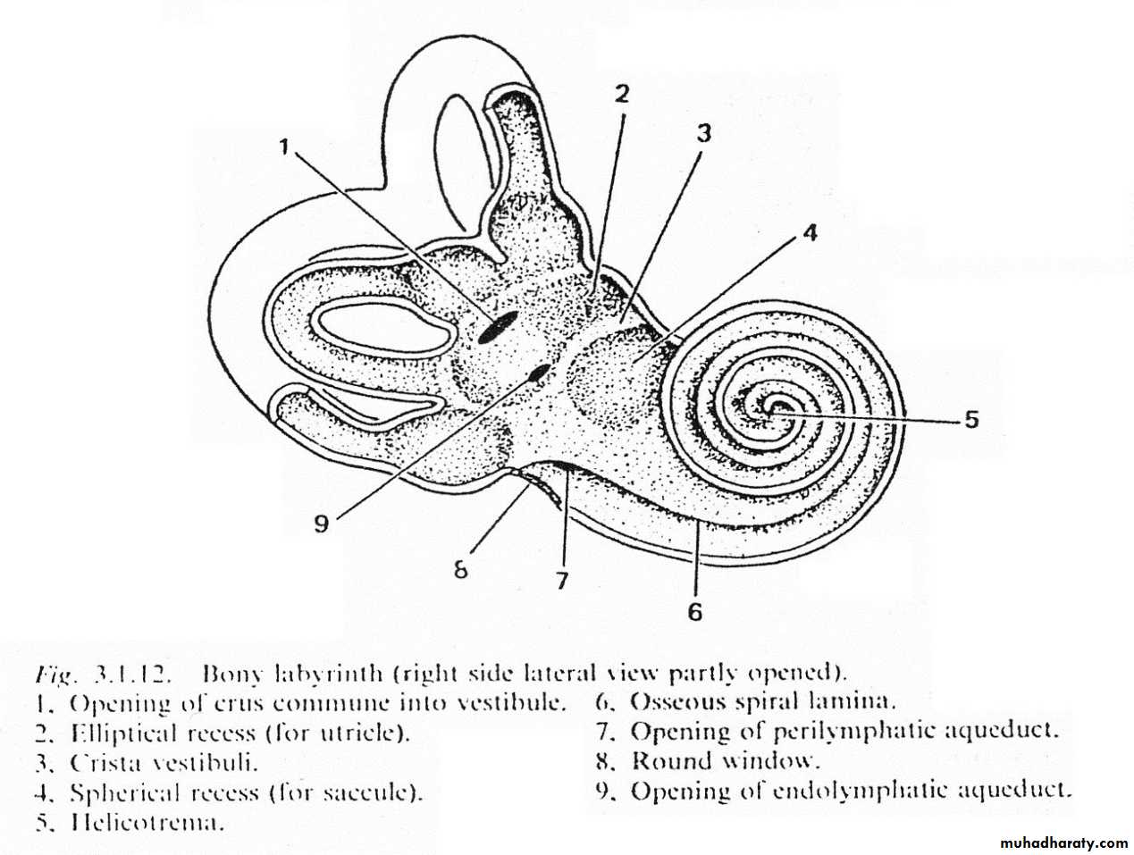 A-Vestibule: The vestibule is the central portion of bony labyrinth, ovoid chamber lying between the middle ear and fundus of internal auditory meatus. On the lateral wall there is the opening of oval window closed by stapes footplate and annular ligament. On the medial wall anteriorly there is spherical recess houses the saccule and perforated by fibers of inferior vestibular nerve. Behind the spherical recess is a ridge, vestibular crest (crista vestibuli).Above and behind the crest is an elliptical recess which houses the utricle. The posterior wall of the vestibule contains 5 openings of the semicircular canals. The anterior wall of the vestibule contains opening into scala vestibuli, of cochlea.