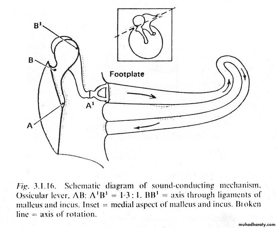 The auricle collects the sound waves, and they pass along the external auditory meatus to the tympanic membrane which is set in motion. The vibrations of tympanic membrane are transmitted to the malleus, incus and stapes. Vibration of stapes (which lies in the oval window) causing vibrations in the endolymphatic compartments of inner ear. The ratio of functioning area of the tympanic membrane to the area of the footplate is 14:1, the ossicular lever ratio of 1.3:1. The product of these area and lever ratios (14 and 1.3) is about 18:1 which represents the transformer ratio.This will increase the sound pressure at the footplate to a degree which causes the fluids of inner ear to vibrate. The stapes moves in rocking motion and, as fluids cannot be compressed, these vibrations are transmitted to round window membrane. This reciprocal action of the oval and round windows is essential. The tympanic membrane is most efficient when the air pressure in the external auditory canal and middle ear is equal, and this is achieved by Eustachian tube which normally opens during swallowing and yawning.