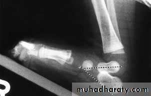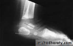 Lines can be drawnthrough the long axis of the talus parallel to its medial border & aline passing in the longtudinal axis of calcanium parallel to its latral border should de 20-40 digree