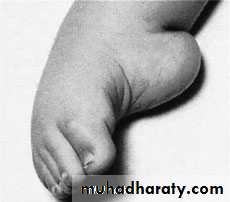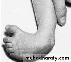 The talus and calcanium are pointing downwards . equines position, while the naviculum and the whole forefoot are shifted medially (adducted) and medially rotated (varus position), there is subluxation of the talo-navicular joint. talipes equinovarus.The soft tissues of the medial side of the foot are short and underdeveloped or contracted.
