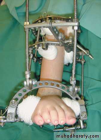 For fixed deformities no much can be done, if special shoe wear is not enough complex bone surgeries and arthrodesis can be done, operations must always delayed after the age of 16 years.