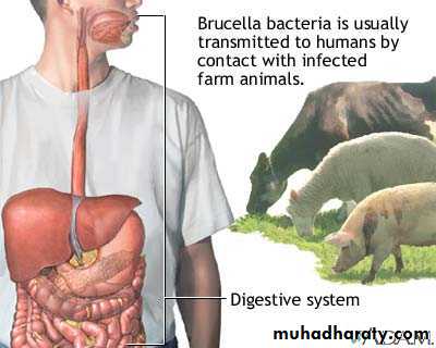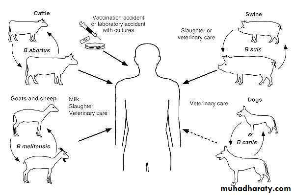 occasionally: placenta, breast milk, sexual, Biological warfare by aerosolized B.melitensis.