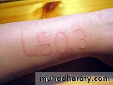 Is an area of focal dermal oedema secondary to transient increase in capillary permeability. It lasts < 24 hours (vs > 24 hours in urticarial vasculitis due to hepatitis B, SLE or idiopathic). This can be clarified by drawing around a weal with a pen and examining the patient 24 hours later. When present for <6 weeks it is an acute urticaria (may be associate with angioedema of lips, face or throat), and for >6 weeks it s a chronic urticaria. Urticaria is characterized by itching.Management urticaria