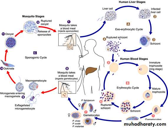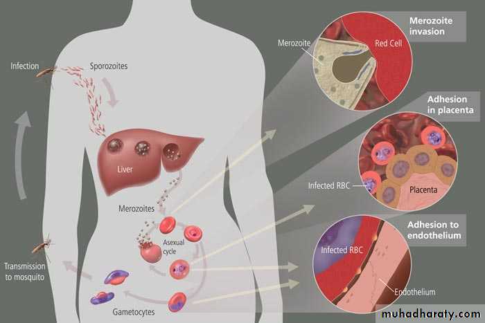 caused by parasitic unicellular protozoon microorganism of the genus Plasmodium.Transmitted via a bite from