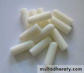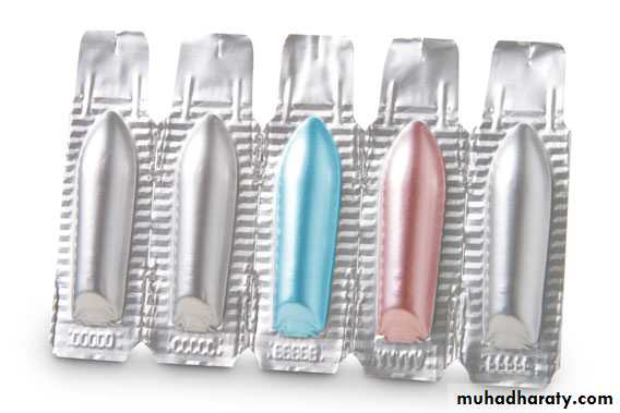 are conical or ovoid solid preparations for insertion into the rectum, where they exert local or less often systemic effect. Their base is fat, wax or glycerol gelatin8.Pessaries:-
