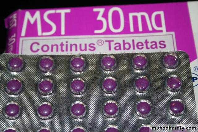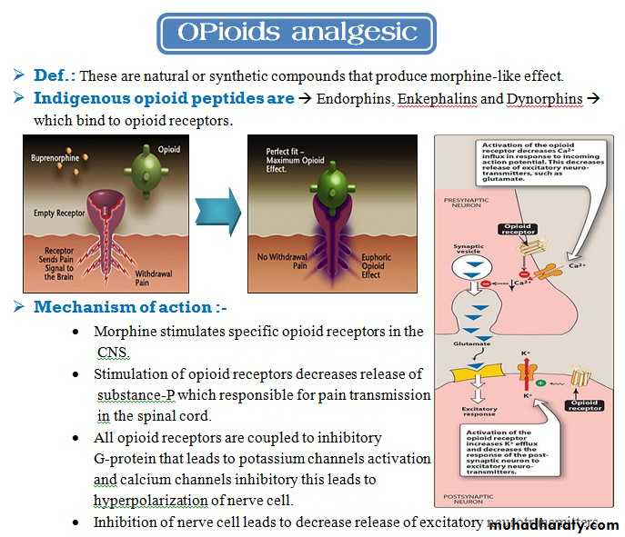 Narcotics: they relieve pain and also cause drowsiness and sedation. The prototype drug is (Morphine) derived from Opium.Opioids: they are natural or synthetic compounds that produce morphine-like action. They act on the CNS causing drowsiness and sedation.