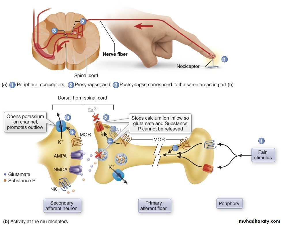 5. Hypothalamus: neuroendocrine secretions.6. The Periphery: they bind to peripheral sensory nerve plexuses and their terminals. They inhibit Ca+ dependent release of excitatory pro inflammatory substances (substance P) from these nerve-endings which may contribute to the anti-inflammatory and analgesic effect of opioids.