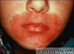This child has a large rash caused by Candidiasis, affecting the skin around the mouth. There are also other lesions that aren't connected to the large lesion, called "satellite lesions".