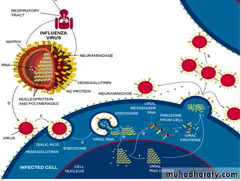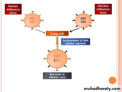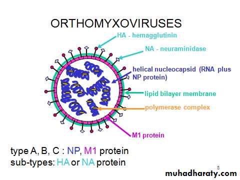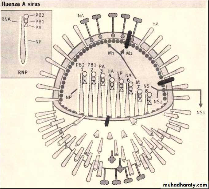 1-Influenza is enveloped virus with segmented ,single –stranded RNA of negative polarity. The two major antigens are HA & NA on separate surface spikes.2-The two surface antigens undergo antigenic variation independent of each other , minor(antigenic drift) , major (antigenic shift).