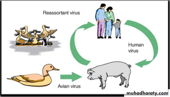 1- Genetic reassortment of surface glycoprotein genes occurs between different strains of a given type (possibly involving animal strains).
