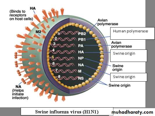 A novel swine-origin H1N1 virus appeared in early 2009 and reached pandemic spread by mid-year. It was quadruple reassortant, containing genes from both North American and Eurasian swine viruses, as well as from avian and human influenza viruses. The virus was readily transmissible among humansLaboratory Diagnosis: