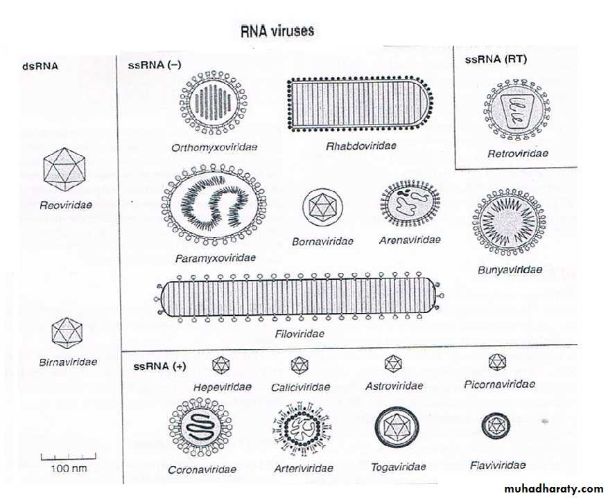 • Families – on the basis of virion morphology, genome structure and strategies of replication.Virus family names have the suffix – viridae.