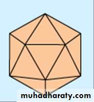 1- Icosahedral symmetryComposed of 12 vertices, has 20 faces (each an equilateral triangle) with the approximate outline of a sphere. e.g. Herpesviruses , Adenoviruses