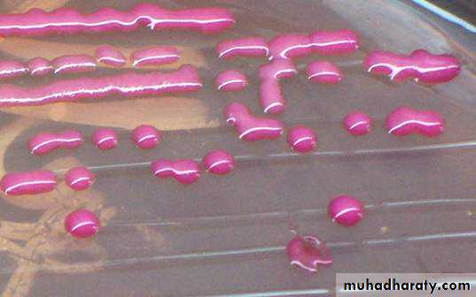 Mucoid, lactose-fermenting colonies on MacConkey's agar.