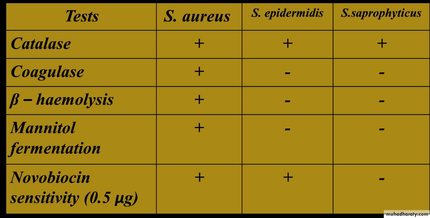 - Mannitol Salt Agar: S.aurues: yellowish discoloration of media, other Staphylococci: no discoloration (remains pink media)
