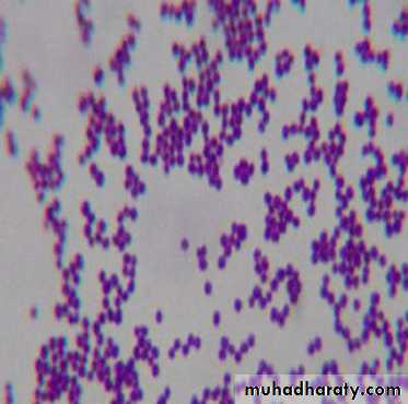 Slide: (microscopic characteristics) :A Gram’s stained film will shows spherical G+ve cocci arranged in grape like irregularCulture: (macroscopic characteristics):