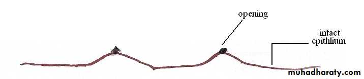 Early lesion is a tiny area of necrosis on superficial mucosa with minute entry site and exhibiting a nodular elevation. These lesions seperated from one another by intact epithelium.