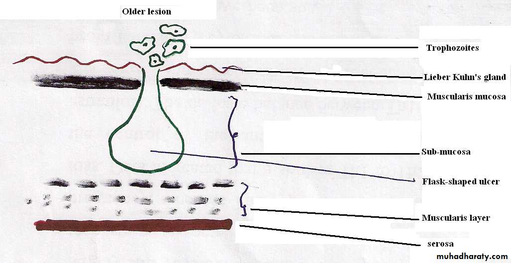 mucosa, followed by destruction and invasion of intestinal wall .-Flask-shaped ulcer is diagnostic for E. histolytica infection.