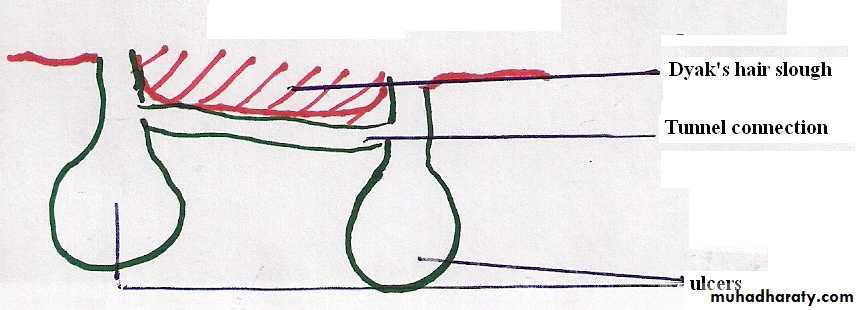 Sometime the dissolution of tissues may become so extensive resulting in a tunneled connection which occurs between two or more lesions, which lead to cutting off the blood supply to the overlying layers, the surface sloughs off and this sloughed area is called Dyak's hair slough.