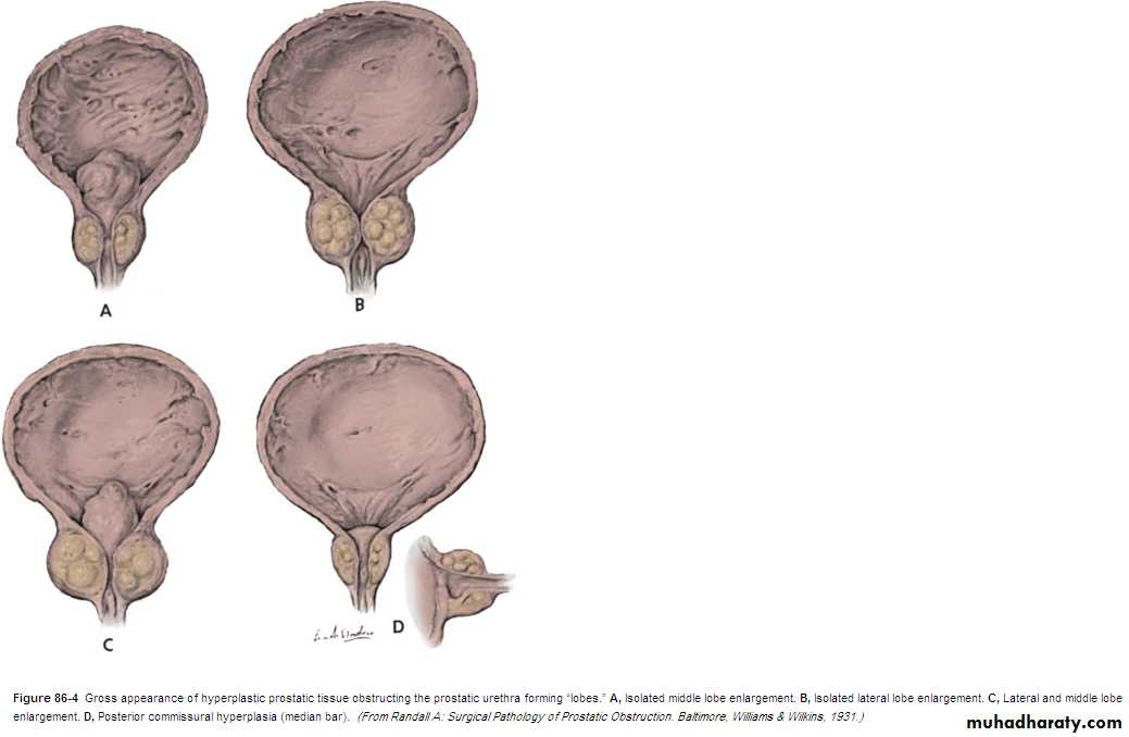 BPH affects both glandular epithelium and connective tissue stroma to variable degrees causing:- Glandular hyperplasia