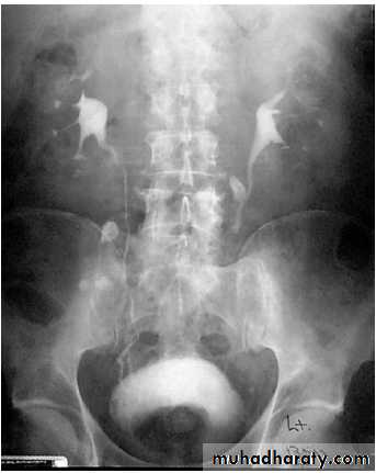 IVU: elevation of bladder base, irregular bladder out line, bladder diverticulum, fish hook lower ureter, vesical stones and residual urine.