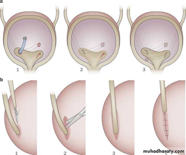 Extravesical techniques involve attaching the ureter into the bladder base and suturing muscle around it (Lich–Gregoir procedure(