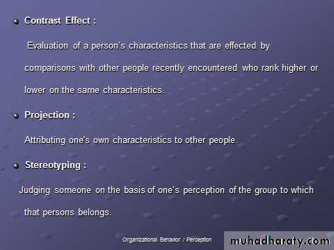 Selective perception:people selectively interpret what they see on the basis of their interests,background,experience & attitude.