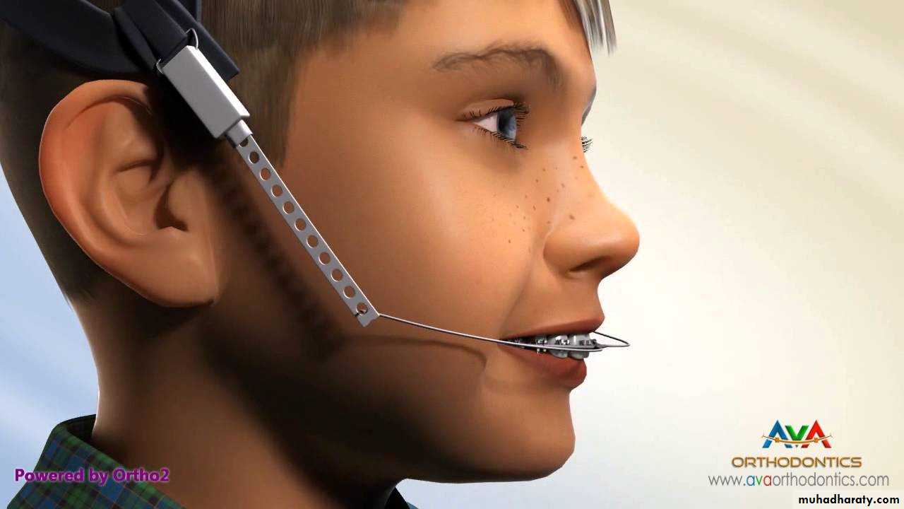 Extra oral orthopedic appliance that consists of a cap that fits on the patient’s chin and a head strap.