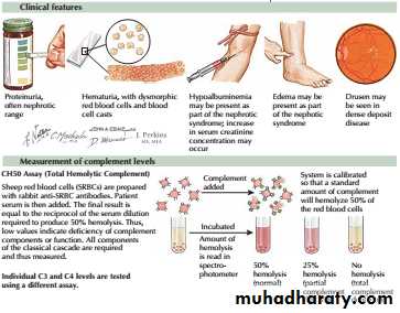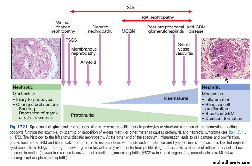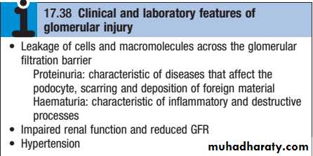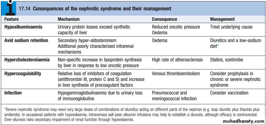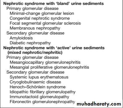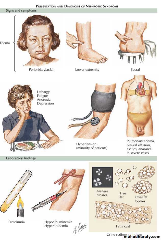 Nephrotic syndrome : massive proteinuria (>3.5g/day),hypoalbuminaemia, oedema, lipiduria andhyperlipidaemia.