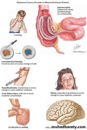 The gastrointestinal disease, which occurs secondary to submucosal edema and hemorrhage, may be limited to pain and vomiting. Some patients, however, may experience more significant complications, such as frank gastrointestinal hemorrhage or intussusception.Less common systemic manifestations include scrotal pain or swelling, as well as central nervous system disease (i.e., headache, seizures).