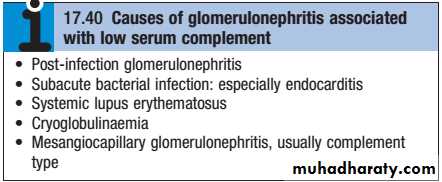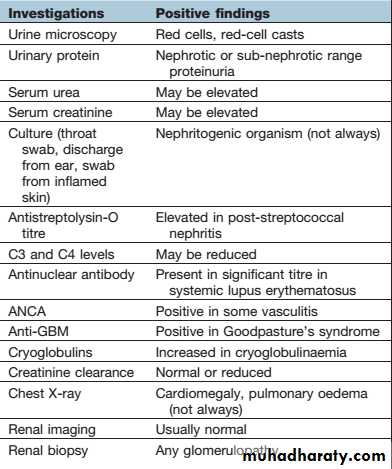 Acute glomerulonephritis (acute nephritic syndrome):abrupt onset of glomerular haematuria (RBCcasts ordysmorphic RBC),non-nephrotic range proteinuria,oedema,hypertension and transient renal impairment.
