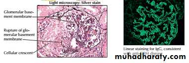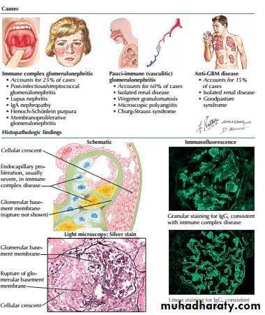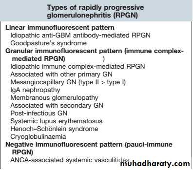 Rapidly progressive glomerulonephritis:features of acute nephritis, focal necrosis with or without crescents and rapidly progressive renal failure over weeks.