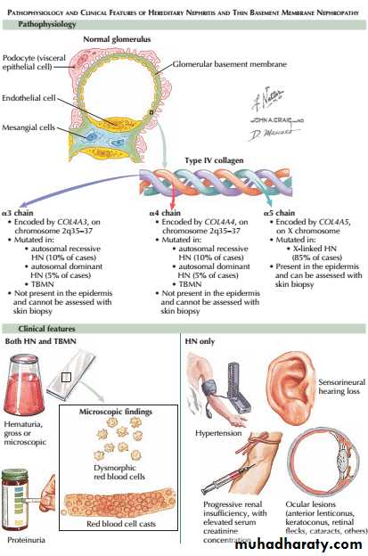 Female carriers of COL4A5mutations usually have haematuria but less commonly develop significant renal disease.Some other basement membranes containing the same collagen isoforms are similarly involved, notably in the cochlea, so that Alport’s syndrome is associated with sensorineural deafness and ocular abnormalities(anterior lenticonus and maculopathy).