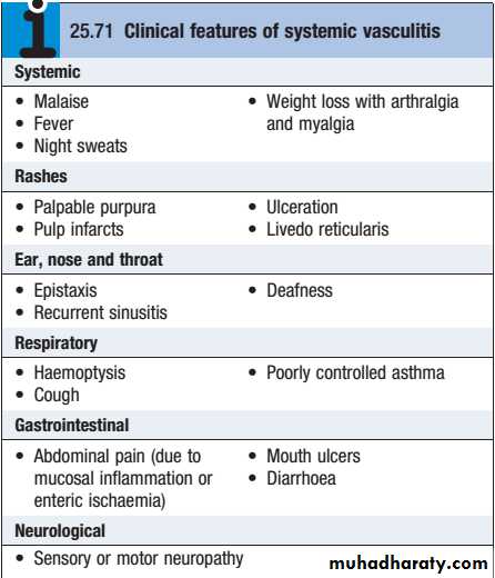 The clinical features result from a combination of local tissue ischaemia (due to vessel inflammation and narrowing) and the systemic effects of widespread inflammation. Systemic vasculitis should be considered in any patient with fever, weight loss, fatigue, evidence of multisystem involvement, rashes, raised inflammatory markers and abnormal urinalysis