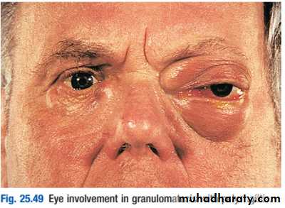 Deafness may be a feature due to inner ear involvement, and proptosis may occur because of inflammation of the retroorbital tissue . This causes diplopia due to entrapment of the extraocular muscles, or loss of vision due to optic nerve compression. Disturbance of colour vision is an early feature of optic nerve compression. Untreated nasal disease ultimately leads to destruction of bone and cartilage.