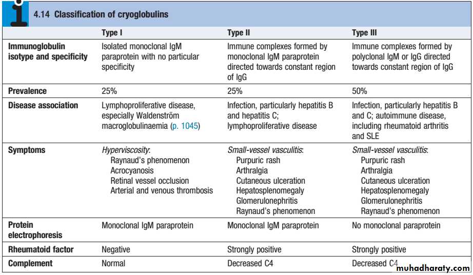 Cryoglobulins (CG)are immunoglobulins and complement components, which precipitate reversibly in the cold.Three types are recognized: