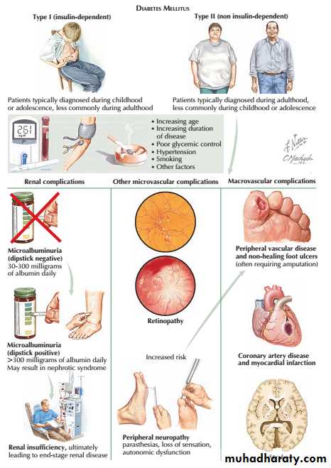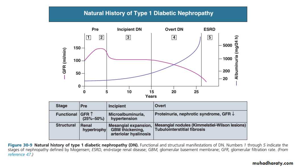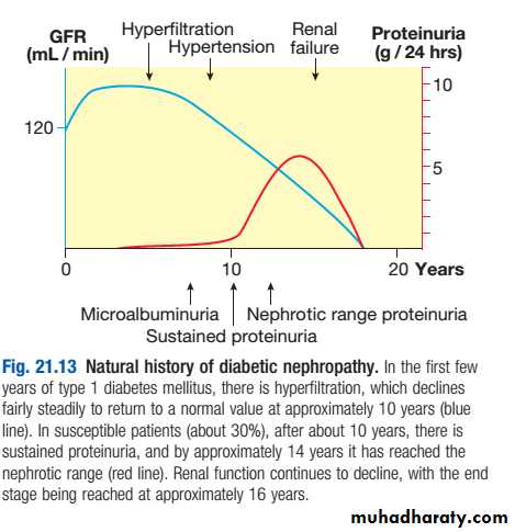 About 30% of patients with type 1 diabetes have developed diabetic nephropathy 20 years after diagnosis, but the risk after this time falls to less than 1% per year, and from the outset the risk is not equal in all patients .