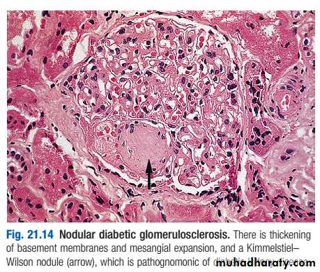 classic diabetic glomerular lesion: Kimmelstiel-Wilson nodular glomerulosclerosis (15-20%) ,and more common lesion is diffuse glomerulosclerosis with a uniform increase in mesangial matrix