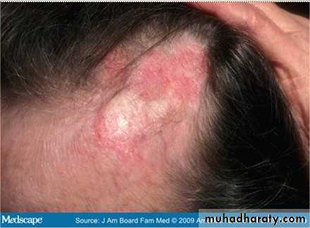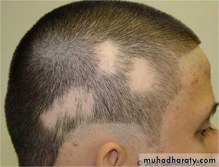 Most patients report the sudden occurrence of one to several 1- to 4-cm areas of hair loss on the scalp that can be easily concealed by covering with adjacent hair.The skin is smooth and white or may have short stubs of hair.