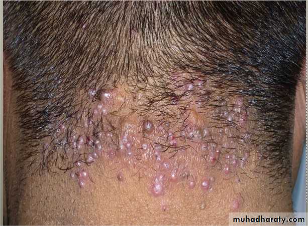 The eyelashes, beard, and, rarely, other parts of the body may be involved.