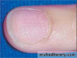 Nail dystrophy may be associated with AA. The incidence is 10% to 66%.Pitting with an irregular pattern, or in organized transverse or longitudinal rows and longitudinal striations, may result in a sandpaper appearance seen in one or all of the nails of some patients with AA.