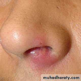 20 years old male patient with 3 days history of painful nasal swelling . Q1- What is the most probable diagnosis?Q2-What is the possible complication? Why?Slide 13