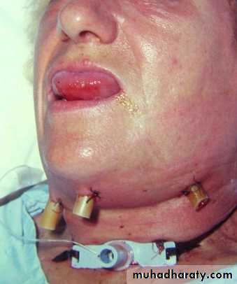 Fifty years old women with lower molar abscess presented with this picture.Q1. What surgical procedure she had underwent?Q2. What was the most common serious complication of this surgical procedure?
