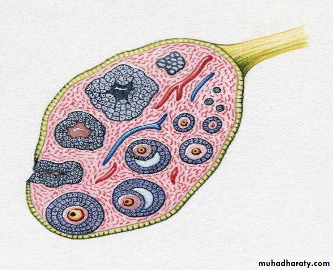 Other cysts are pathological, such as those found in polycystic ovary syndrome, or those associated with tumors.