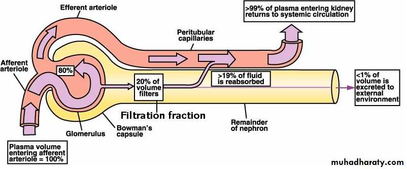 The fraction of the renal plasma flow that becomes glomerular filtrate.Since the normal plasma flow through both kidneys is 650 ml/min and the normal GFR is 125 ml/min, the average filtration fraction is about 20%.