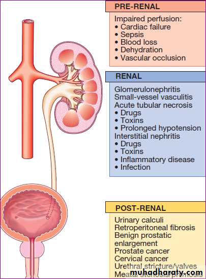 b. ‘renal’, the primary insult affects the kidney as in GN or by nephrotoxic drugs ,which can cause ATN .