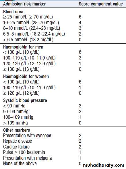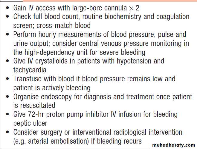 Management (continued)• Identify comorbidity. cardiorespiratory, cerebrovascular or renal disease is important, because these may be worsened by acute bleeding and because they increase the hazards of endoscopy and surgical operations. These factors can be combined using the Blatchford score , which can be calculated at the bedside.